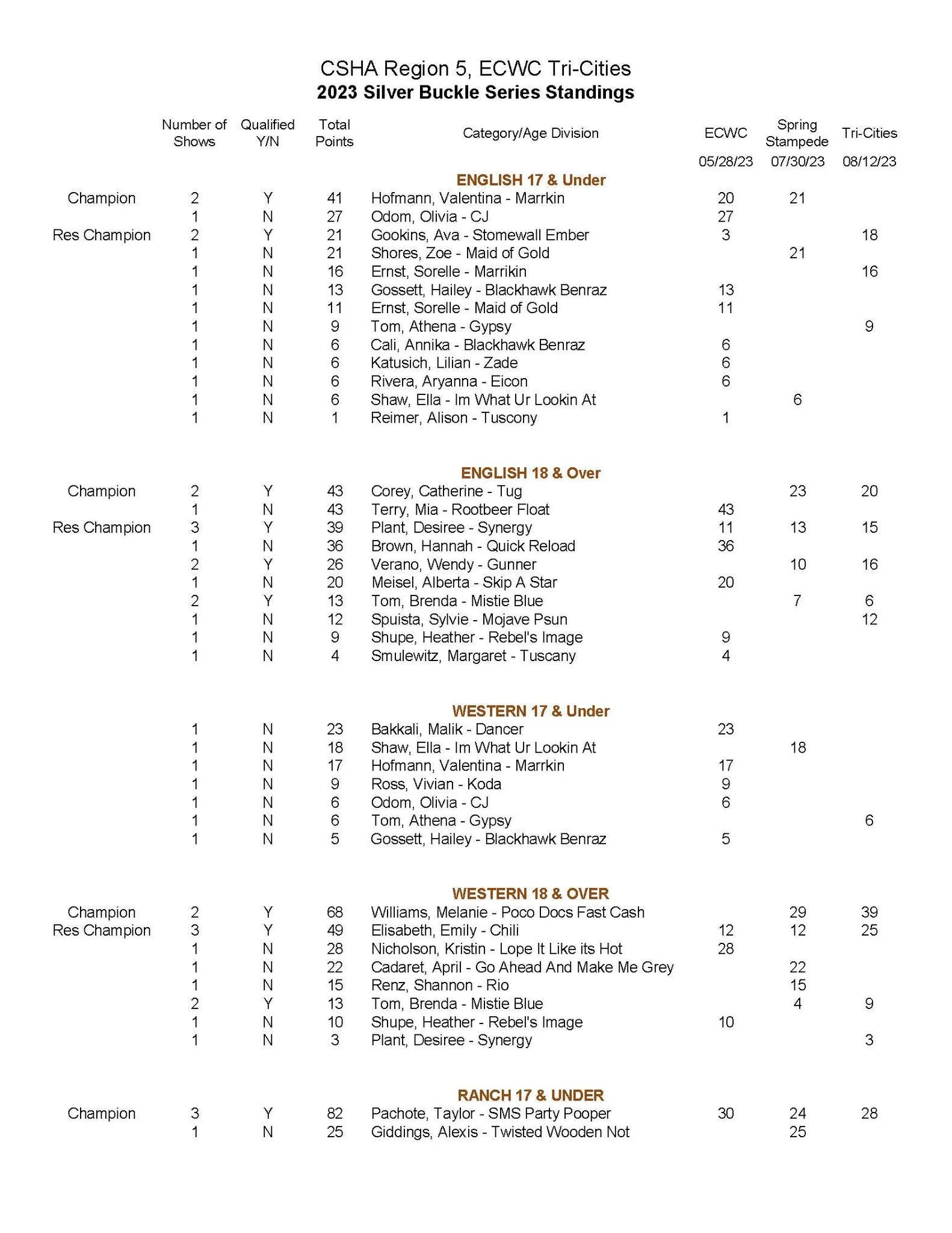 Congratulations to the high point winners of the 2023 California State Horsemens Association Region 5, Equestrian Center of Walnut Creek, and Tri-Cities Horsemen’s Association’s Silver Buckle Series!